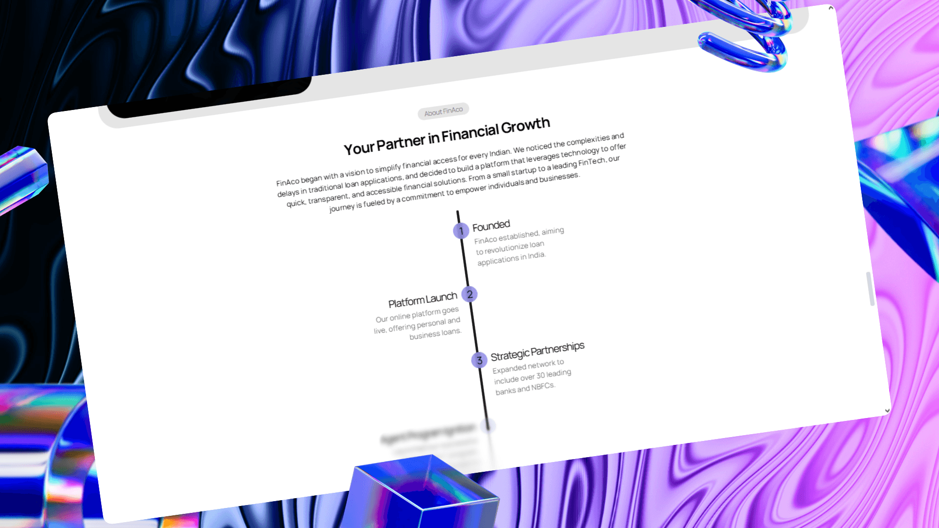 We implemented a clean, professional design that uses confident typography and a structured timeline format to quickly narrate FinAco's journey and milestones. Key execution points included integrating strong calls-to-action like "Apply Online" and "Chat on WhatsApp" for immediate conversion. We structured the content to clearly detail the benefits of the agent program, making the earning potential concrete (e.g., ₹2,000 to ₹80,000 per successful loan case).